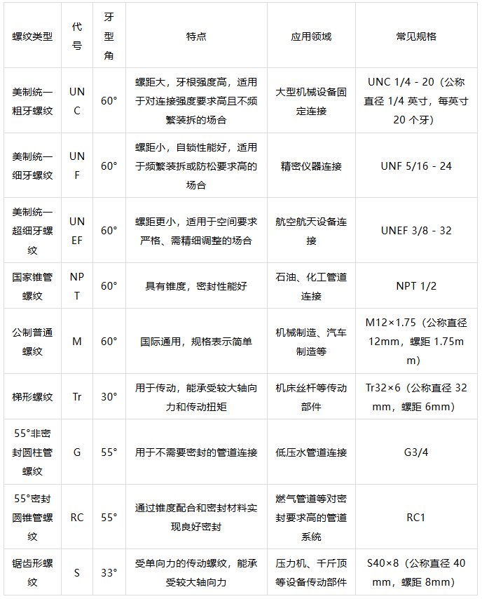 在机械制造、管道工程等众多领域,螺纹作为一种关键的连接方式,发挥着不可或缺的作用。不同的螺纹规格适用于不同的应用场景,了解各种螺纹代号的含义和特点,对于工程师、技术人员以及相关从业者来说至关重要。本文将详细介绍常见的螺纹规格,包括 UNF、NPT、G、RC 等,并在文末提供“螺纹规格速查对比表”,帮助读者快速掌握螺纹规格的相关知识。